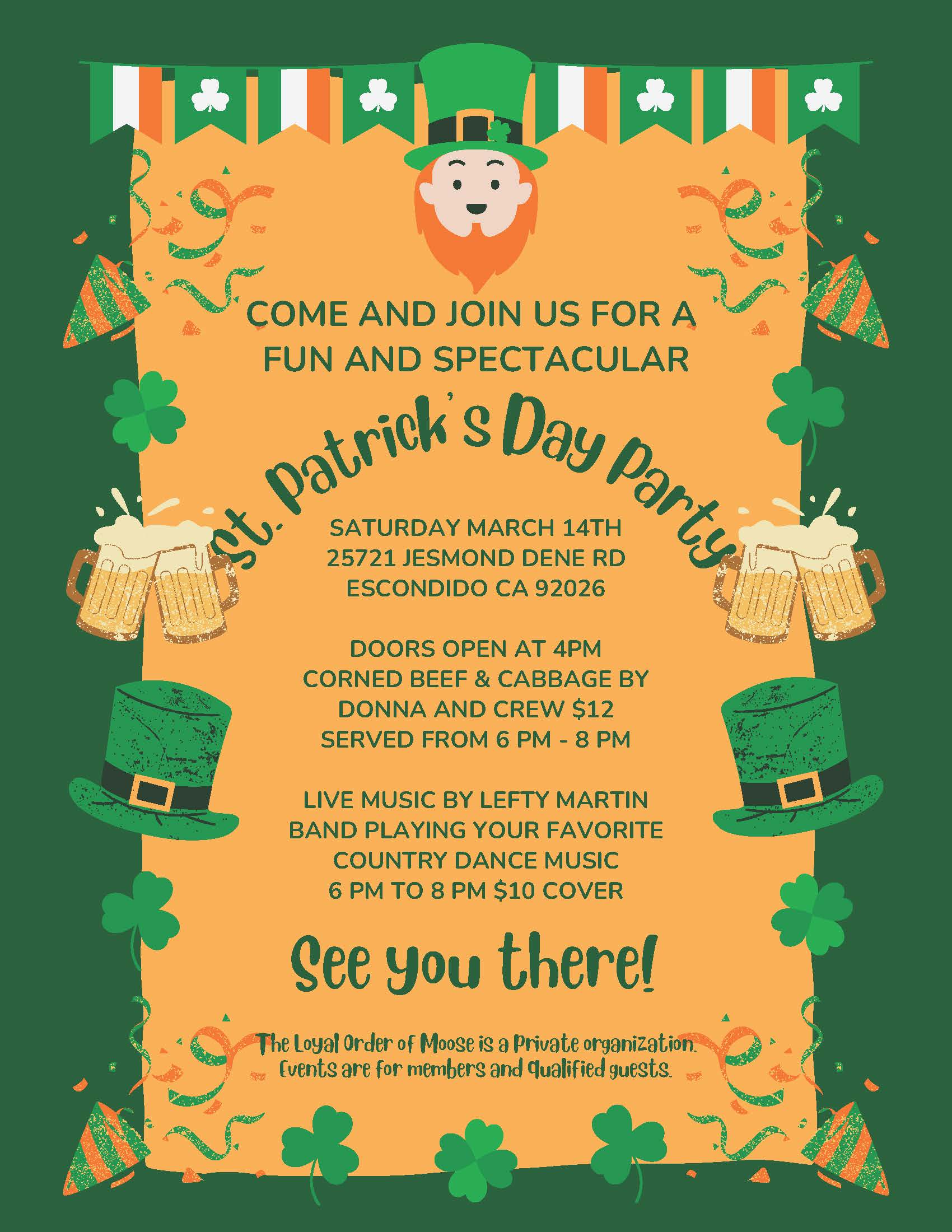 SATURDAY NIGHT MARCH 14, 2026-ST PATRICK’S DAY CELEBRATION-,LEFTY MARTIN BAND 6-10 PM PLAYING YOUR FAVORITE COUNTRY DANCE MUSIC!