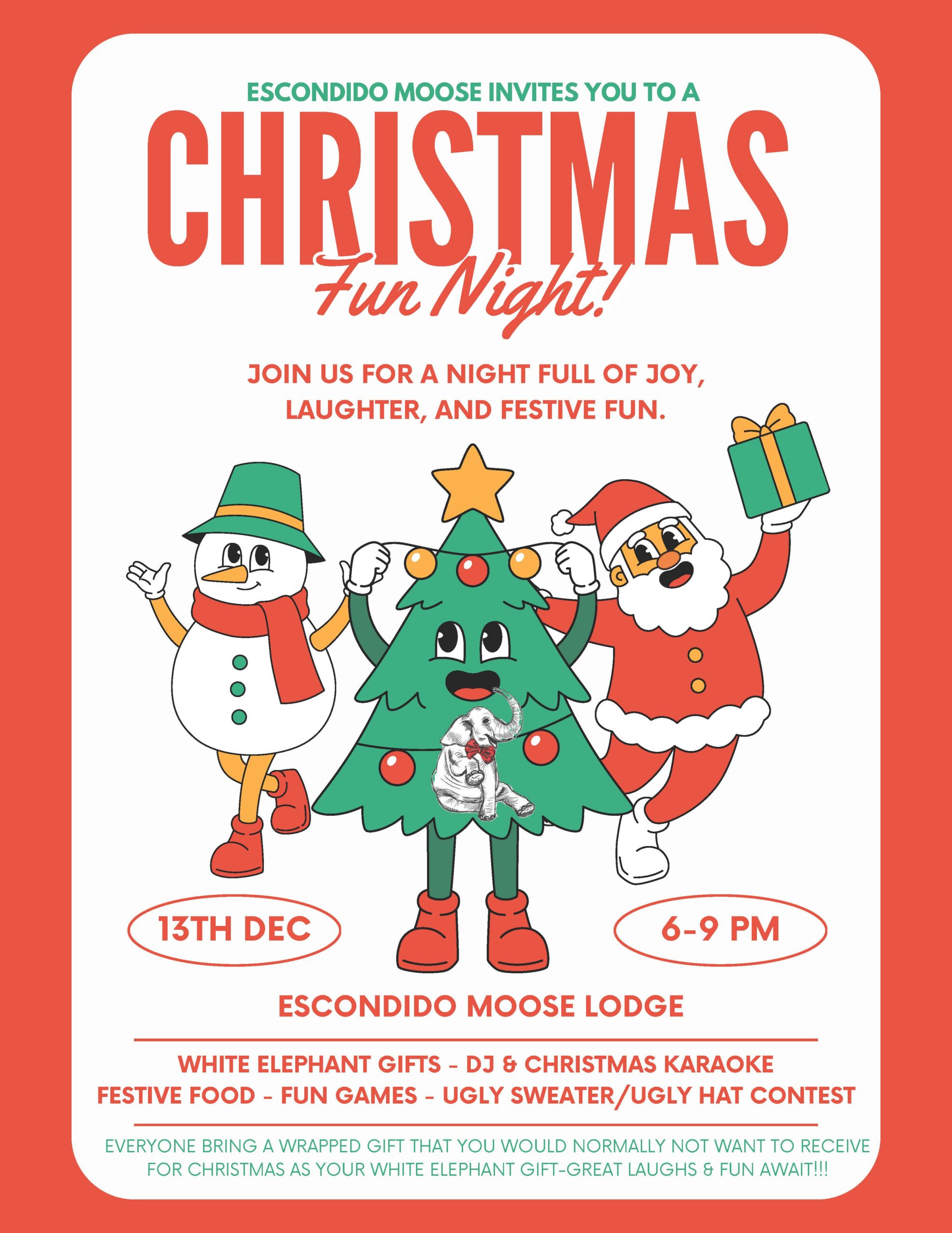 Open Days This Week Monday – 4-9 pm Tuesday 4-8 pm Wednesday 4-9 pm Thursday 4-8 pm Friday 4-9 pm Saturday 4-11 pm Sunday 8 am-2 pm Home LODGE WOTM Moose Legion Newsletter Moose Links Events Calendar Contact Us ESCONDIDO LODGE, SATURDAY, DECEMBER 13th 6-9 PM, LODGE CHRISTMAS PARTY WITH DJ ENJOY SUNDAY MORNINGBREAKFAST AT THE LODGE8:30 – 11:30 AM! MOST SATURDAYS DINNER 6-8 PM LIVE BAND 6-10 PM